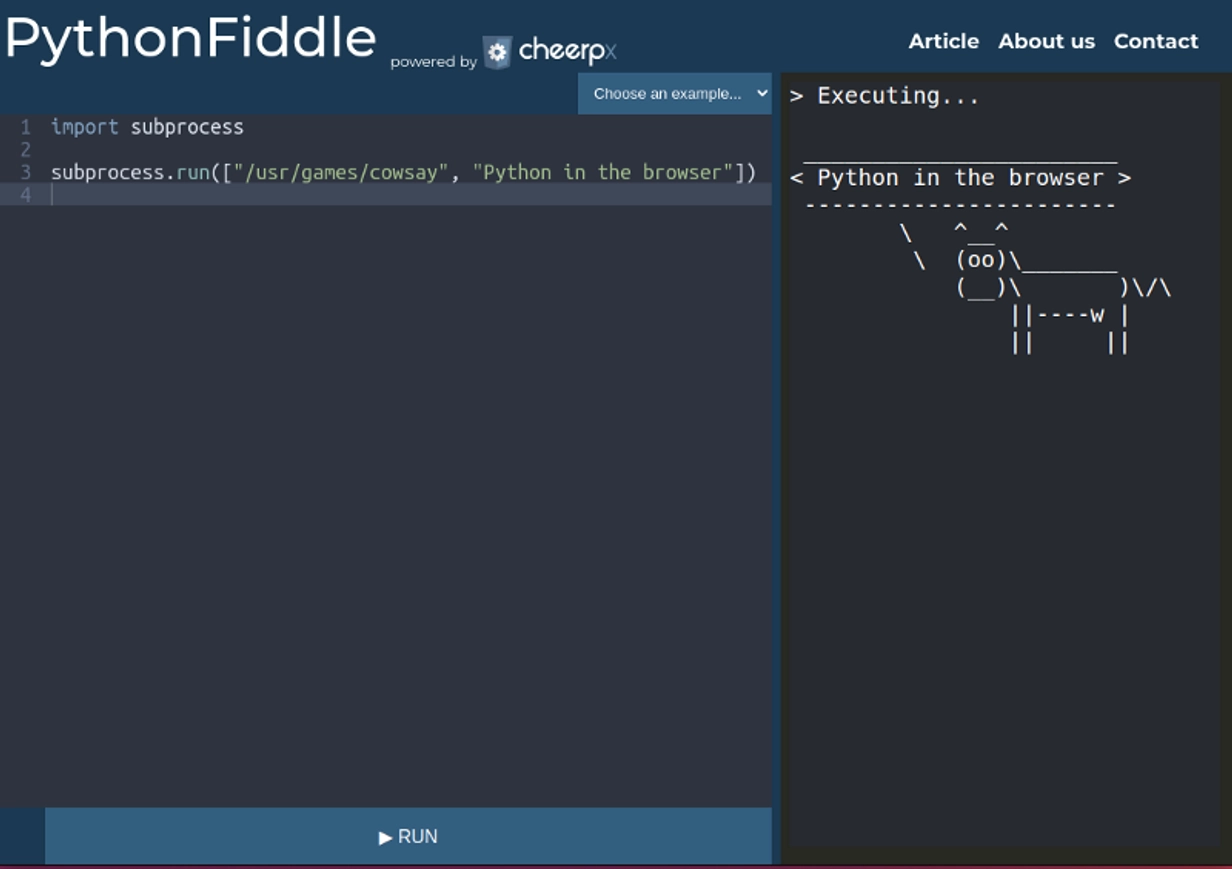 - CheerpX: runs the python interpreter with the user-written code snippet in real time in the browser.